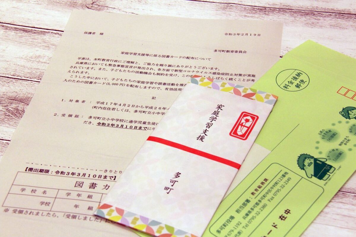 多可町教育委員会は、町内在住および町内の小中学校に通う小中学生を対象に、図書カード1人5000円分を配布しました。コロナ禍の中で勉学に励む子どもたちの、家庭学習や読書活動を支援しようというもので、図書カードは学校を通じて子どもたちに配布される予定です。