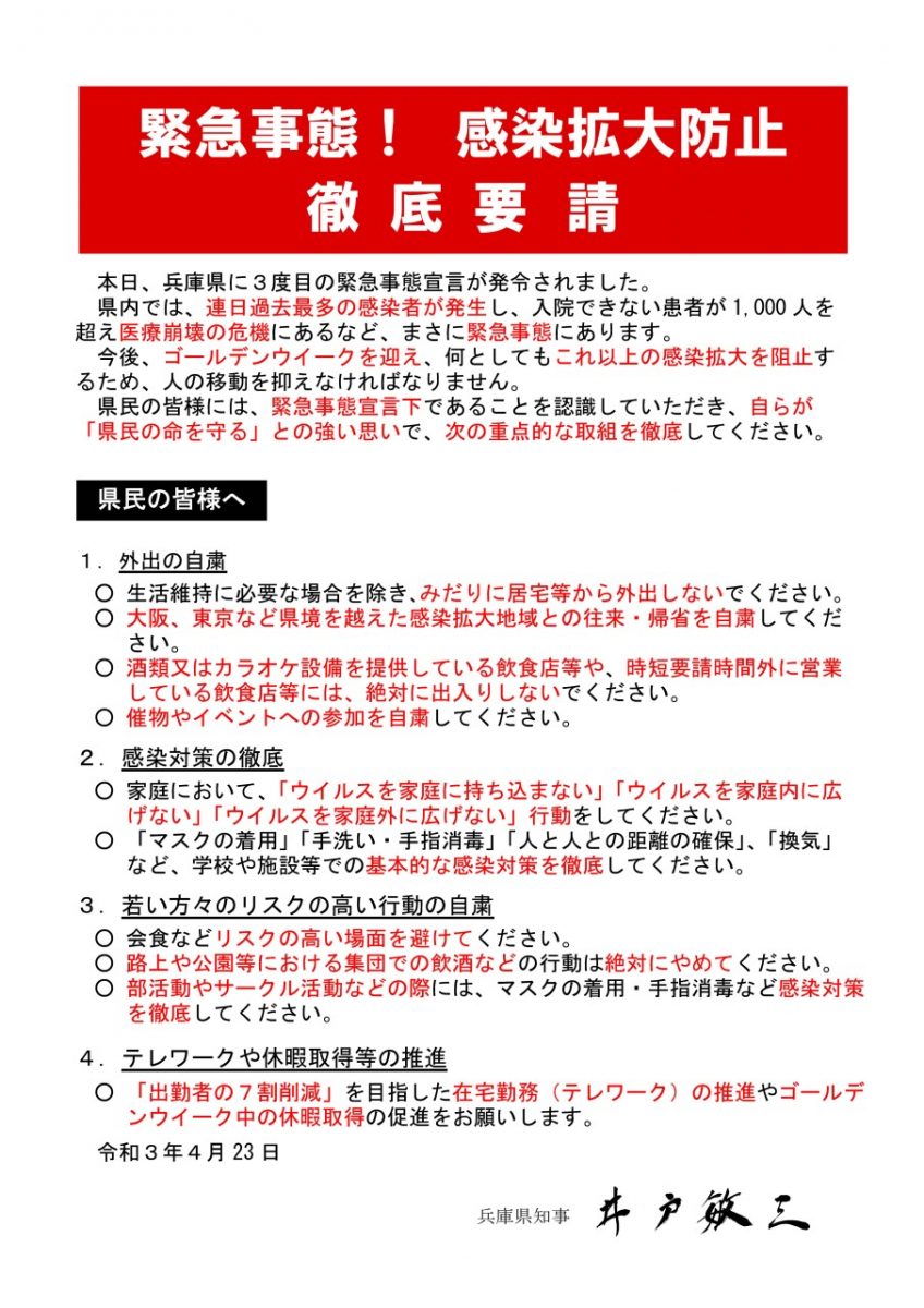 【兵庫県】三度目の緊急事態宣言|県内全域対象に
