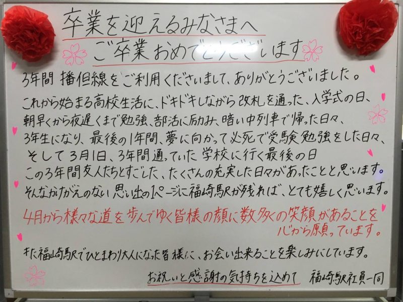 「今年も「福崎駅社員一同」さんより♪卒業を迎えるみなさまへおめでとうございます。」についての追加情報、感想などをコメントまでお寄せください。