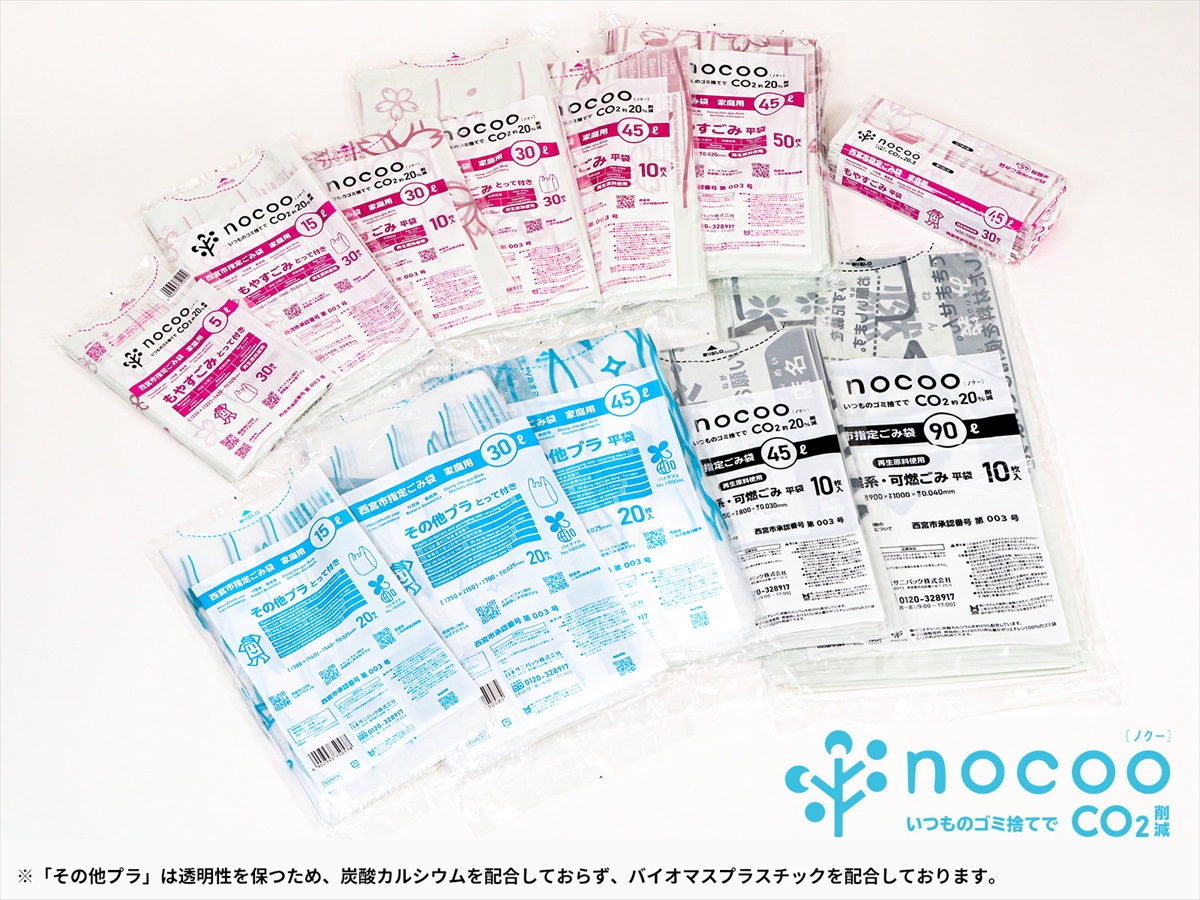 ごみ袋の製造は、ポリ袋・ゴミ袋の開発・製造を行っている日本サニパック株式会社。「もやすごみ」用と「可燃ごみ」用のごみ袋には、サニパックが展開する環境配慮型商品「nocoo(ノクー)」の技術をベースとし、原料に天然ライムストーン(炭酸カルシウム)を配合し、100%石油由来のポリ袋と比較して製造時、燃焼時のCO2排出量を約20%削減できるとのこと。