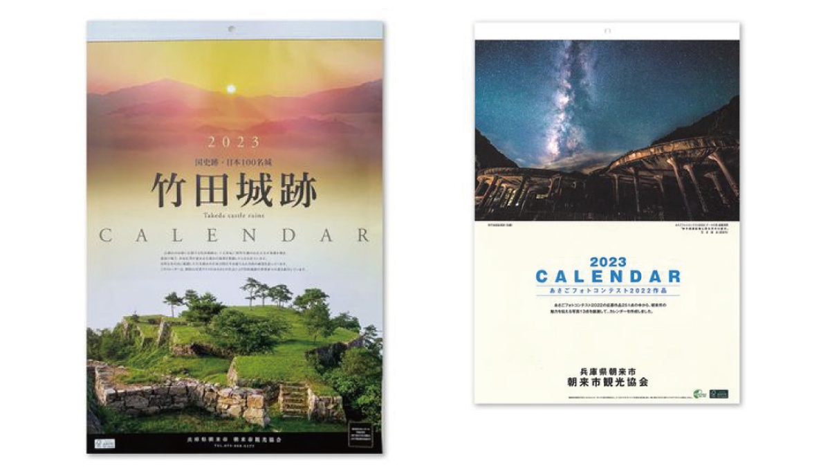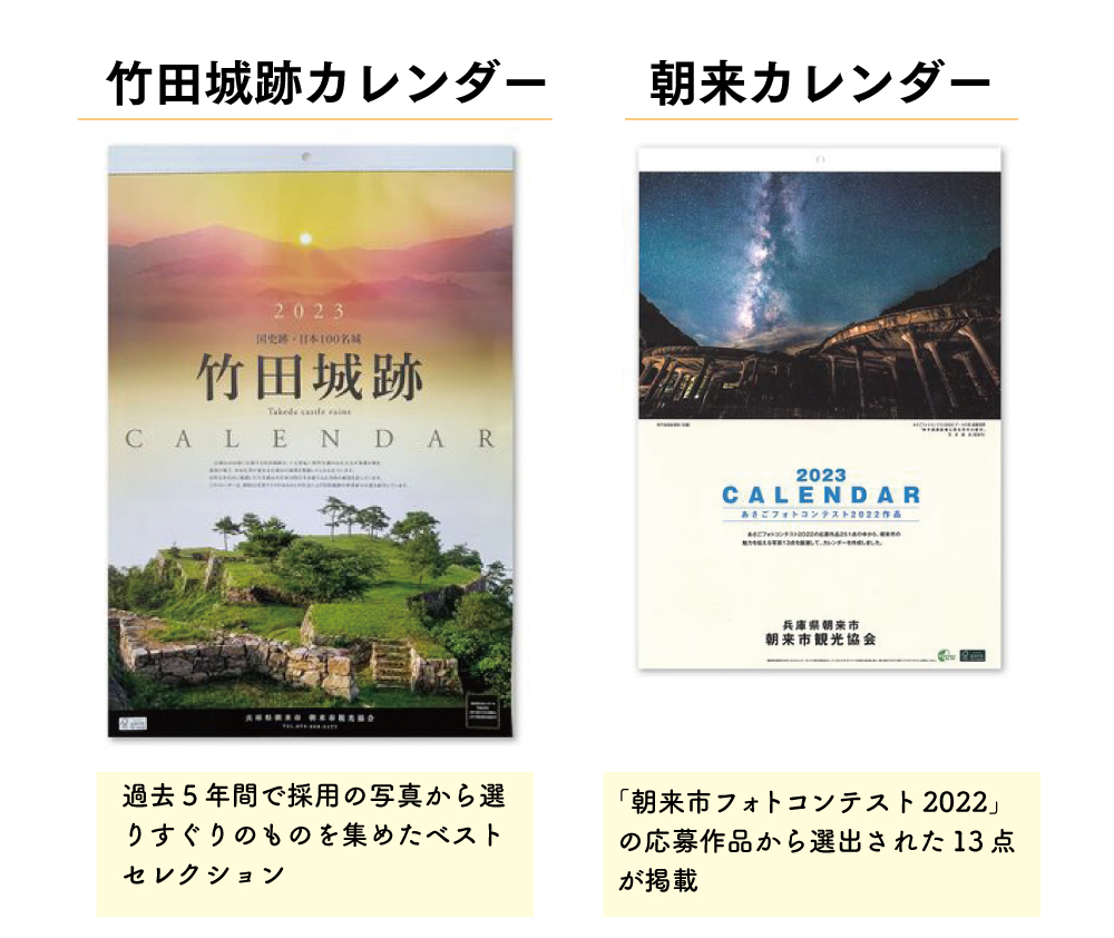 竹田城跡カレンダーは過去5年間で採用された写真から選りすぐりを集めたベストセレクション。朝来カレンダーは、朝来市フォトコンテストの応募作品の中から選出された13点が掲載されています。