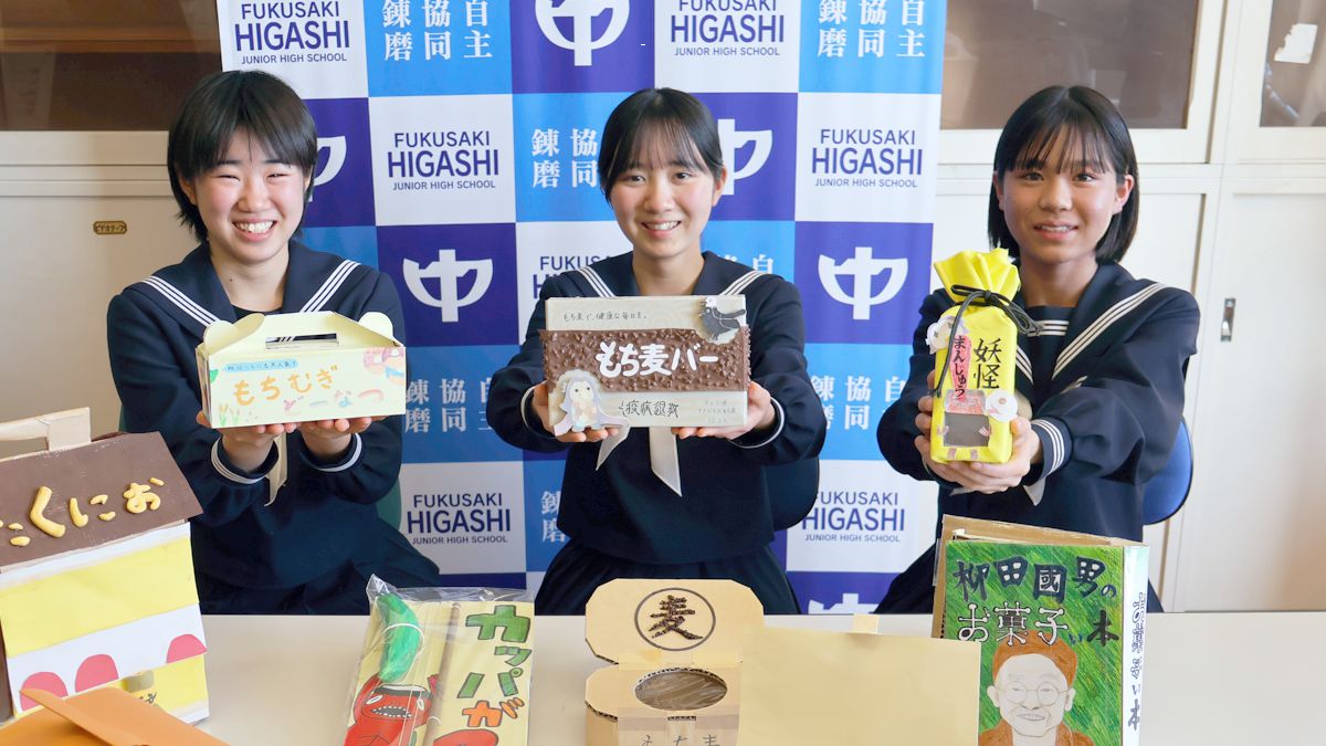 兵庫県福崎町の魅力をもっと多くの人に知ってもらうため、福崎東中学校の3年生が美術科の授業で「福崎町のおみやげ」をテーマに、おみやげ商品の企画とパッケージデザインに挑戦。