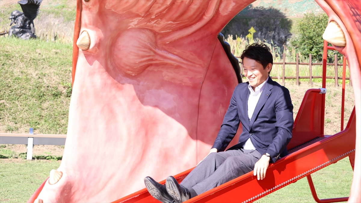知事は、この春設置されたばかりの「キモリアル」な河童の妖怪「ガジロウ」をモチーフにしたスライダー(すべり台)を体験!