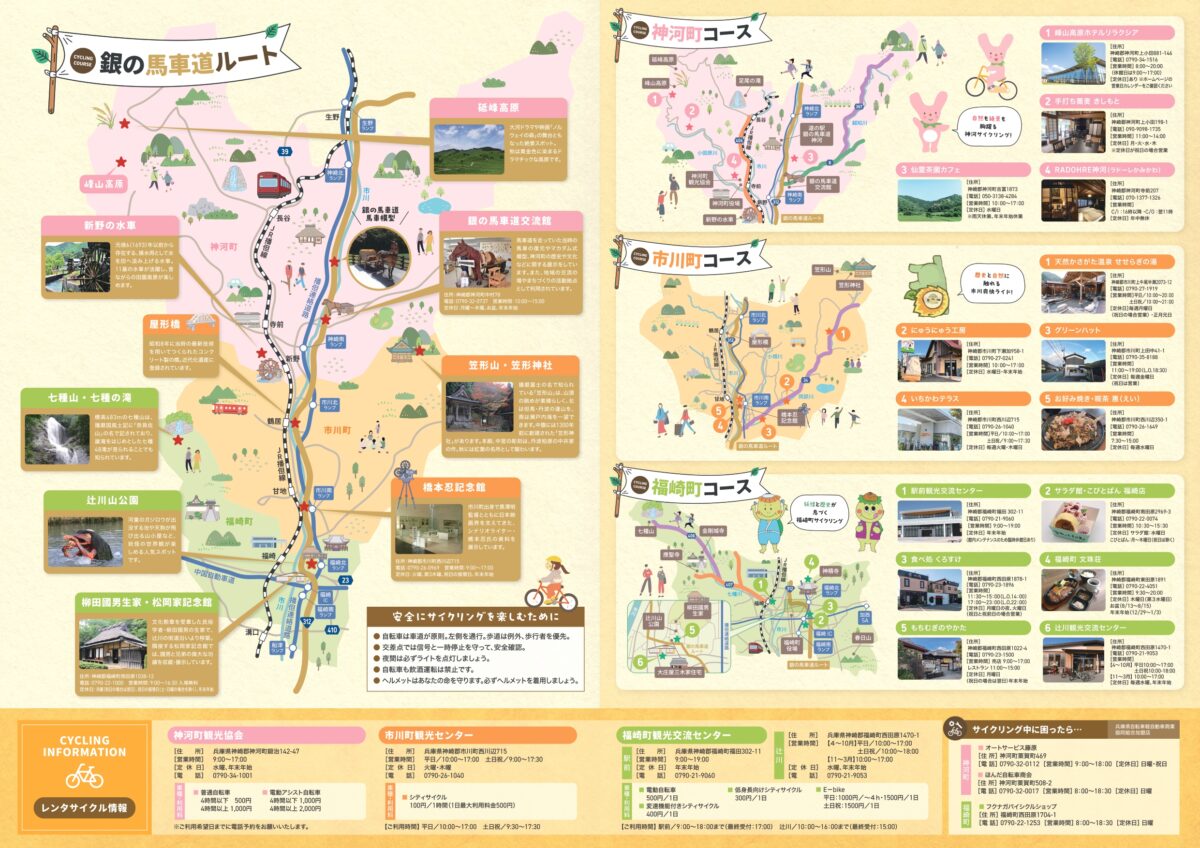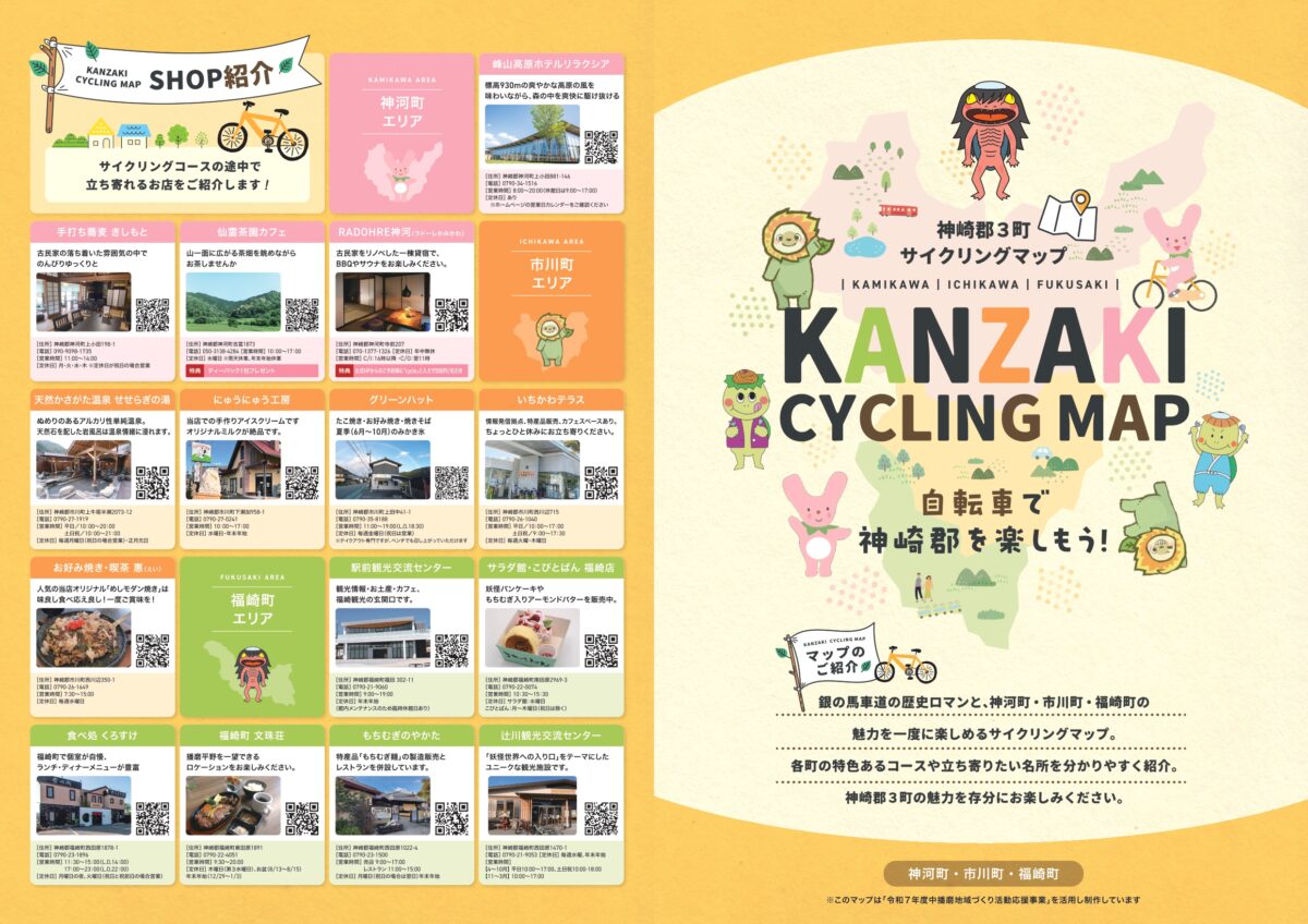 このマップでは、神崎郡内を走る際のモデルコースや、周辺の立ち寄りスポットなどがまとめられており、サイクリングを楽しむ際の目安として活用できる内容となっています。