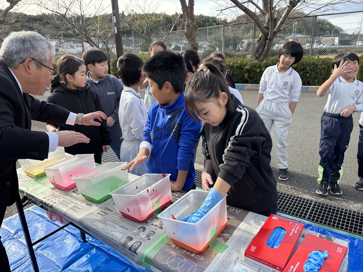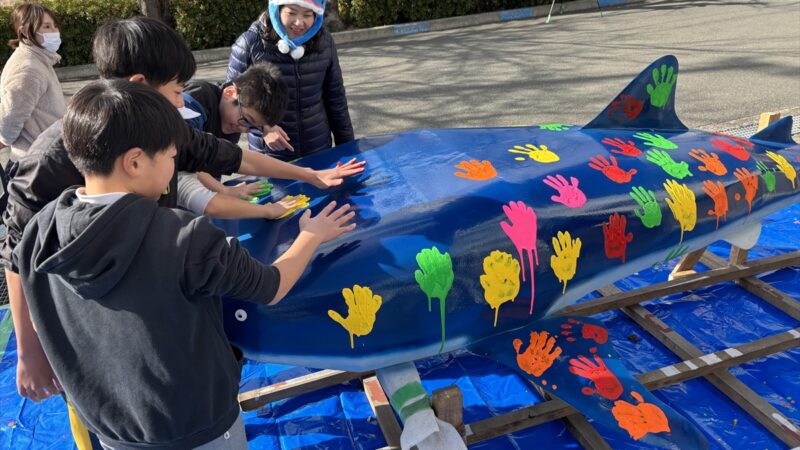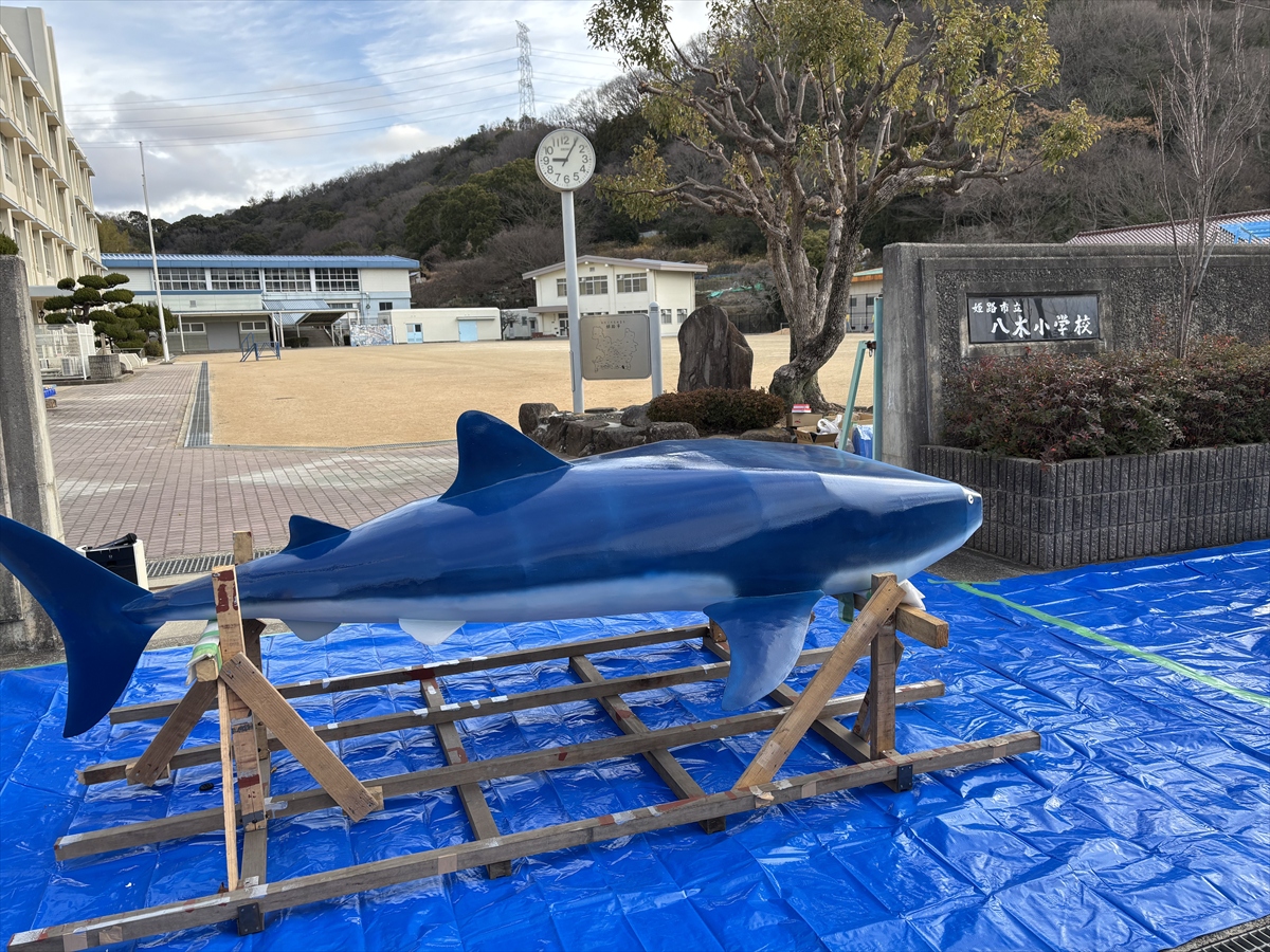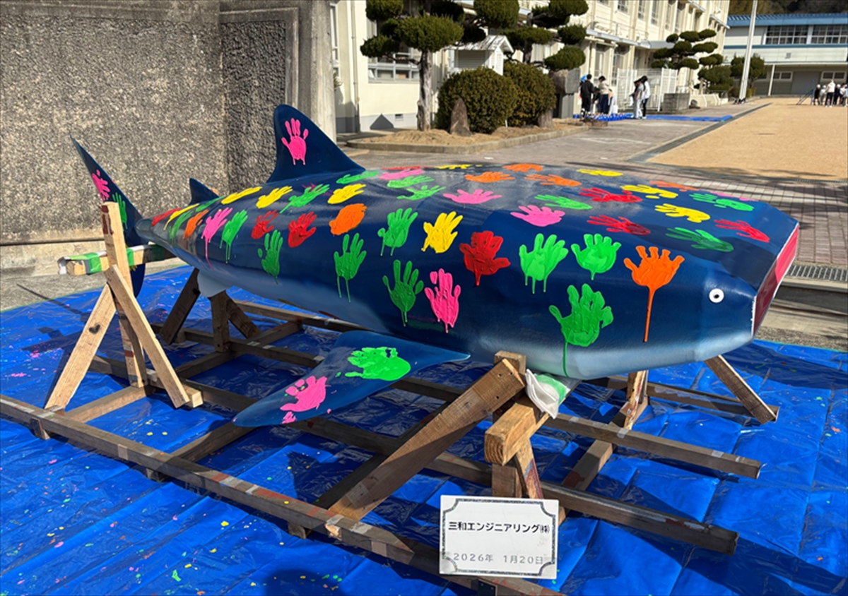 2026年1月、姫路市立八木小学校にて、地元のプラントメーカー・三和エンジニアリング株式会社(本社:兵庫県)が製作した全長2.5メートルの「鉄のジンベイザメ」オブジェに、全校生徒が手形を彩る仕上げイベントが開催されました。