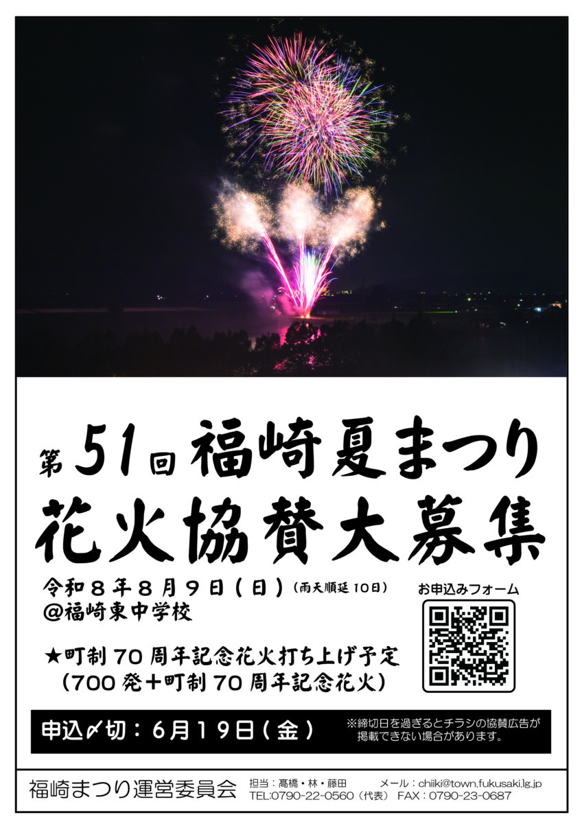 福崎町では、「福崎夏まつり」に向けて、「第51回福崎夏まつり」の花火協賛の募集を開始しました。