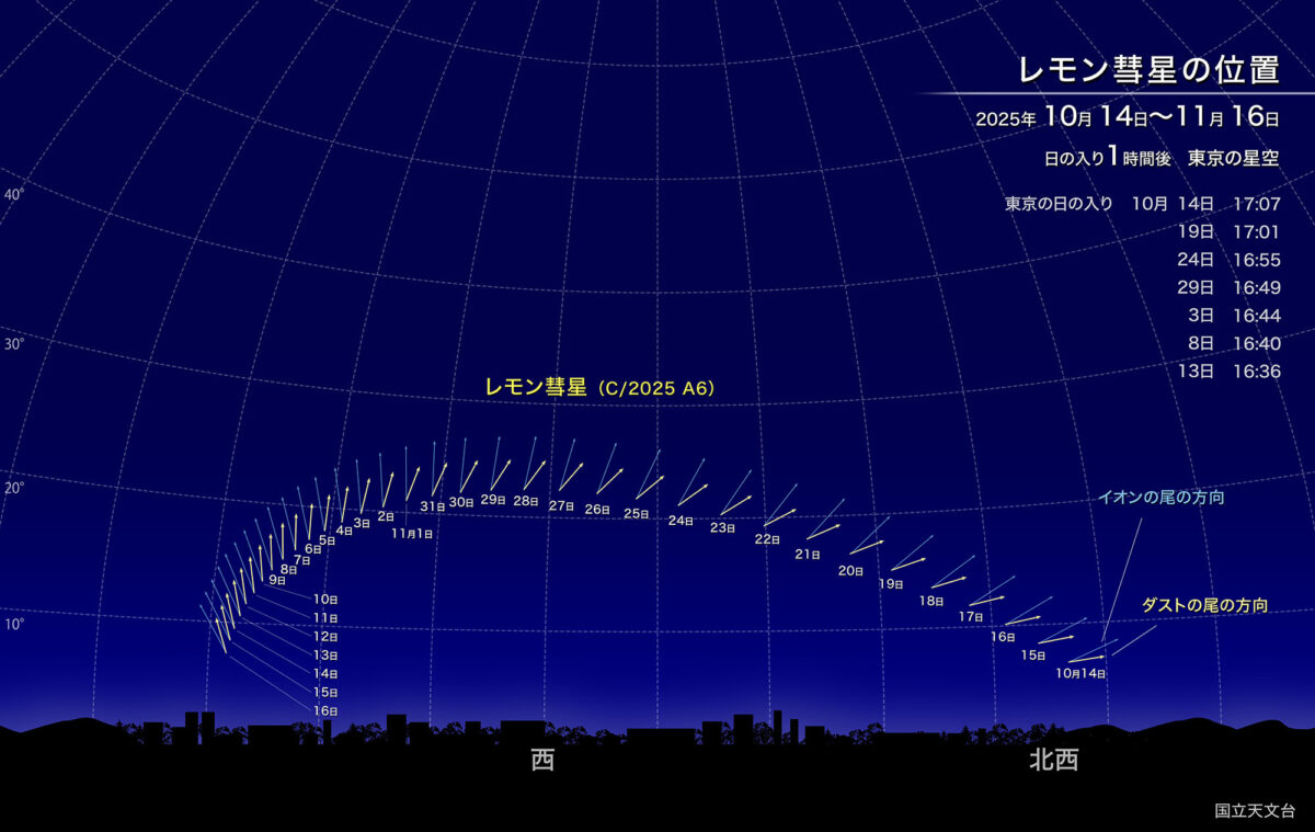 レモン彗星は夕方の空にだけ見えるようになり、特に10月23日から11月2日までは、日の入り1時間後の地平高度が20度以上を保ちます。低い空ではありますが、比較的見やすい高さになります。