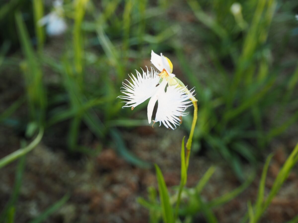 姫路市の市花でもあるサギソウは、開発等で環境の変化、シカ、イノシシによる獣害等で自生地の環境が悪くなっており、消滅の危機がある準絶滅危惧植物。
