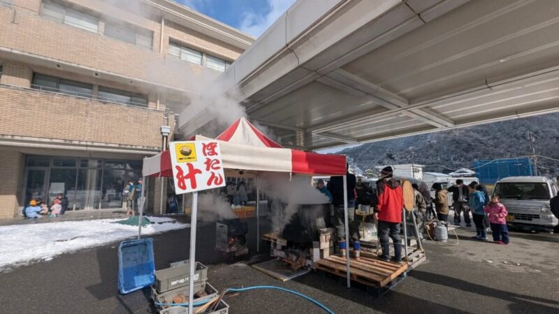 地域のボランティアの皆さまによって、予定通り「ぼたん汁」のふるまいが行われました。雪が降る寒さの中、アツアツのぼたん汁は、会場に集まった方々の心と体を優しく温めてくれました。