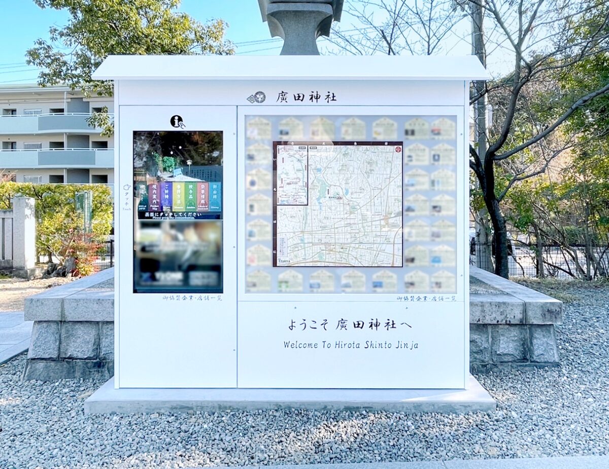 廣田神社ナビタは、参道に設けられた注連柱の奥に設置され、高さ2290mm・横幅2580mm・奥行577mmのサイズ。日本語と英語で境内案内や神道の解説の提供が可能で、右手には、古地図風の周辺案内図があり、周辺・広域の情報を提供しています。
