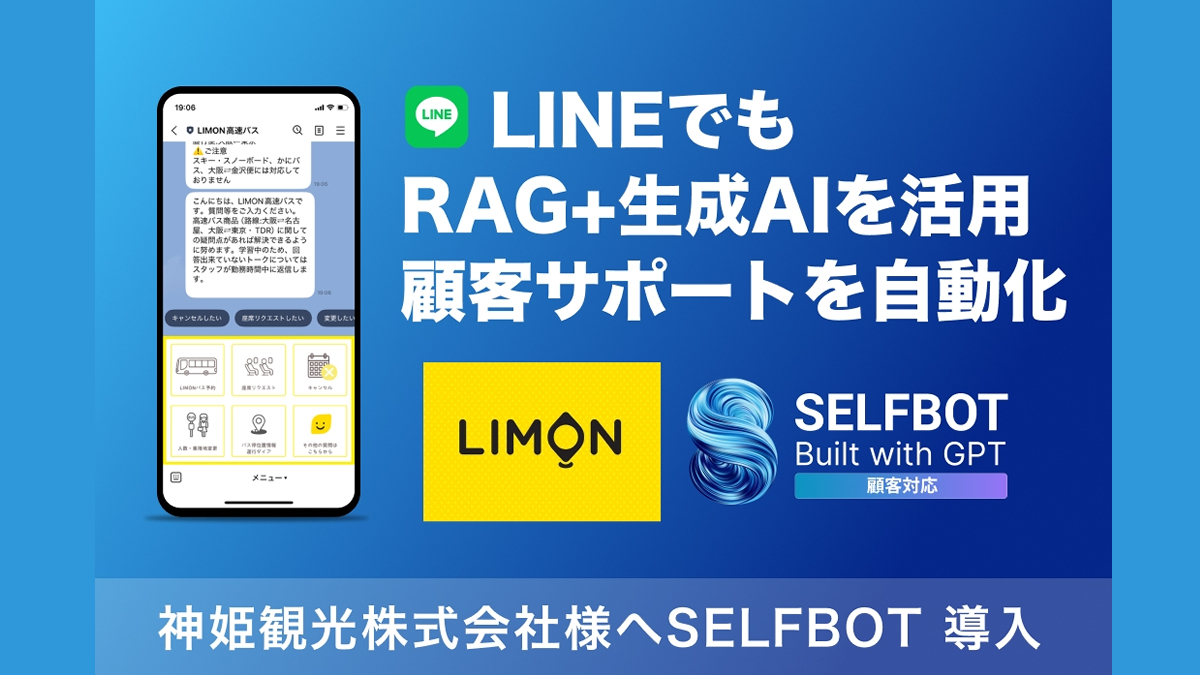 SELF株式会社は、ChatGPTと連携したAIチャットボット「SELFBOT」を神姫観光株式会社の展開する”LIMON”のWebサイト、およびLINE公式アカウントに顧客対応の効率化を目的として導入しました。