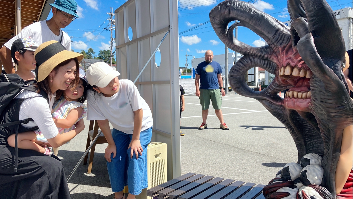 観光交流センターを訪れていた家族連れの観光客は、さっそく新妖怪ベンチとパシャリ。妖怪の町「福崎町」を楽しみました。
