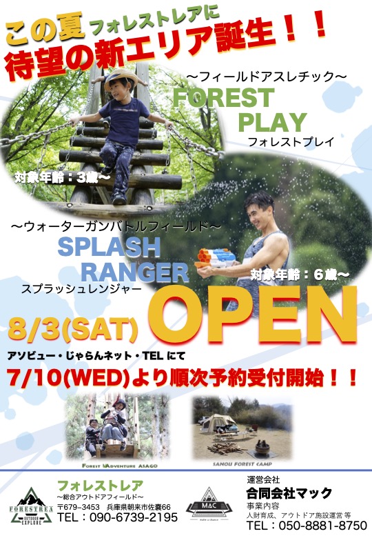 日本初となる常設されたウォーターガンバトルフィールド『スプラッシュレンジャー』と低学年から楽しむことができるフィールドアスレチック『フォレストプレイ』がオープン。