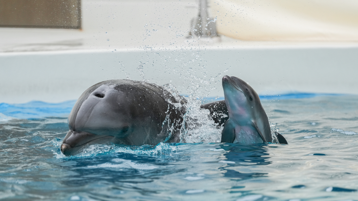 現在、赤ちゃんイルカは母獣「ポップ」とともにドルフィンビーチに移動しており、母子で寄り添いながら元気に泳ぎまわる様子を観察いただけます。母子の体調を最優先とし状況により観覧を規制する可能性はございますが、キャスト一同とともに赤ちゃんイルカの健やかな成長を優しく見守ってください。