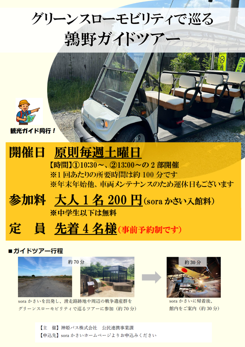 「soraかさい」(加西市)にて、地域に点在する戦争遺跡を巡る電動ツアーが毎週土曜日に開催されています。