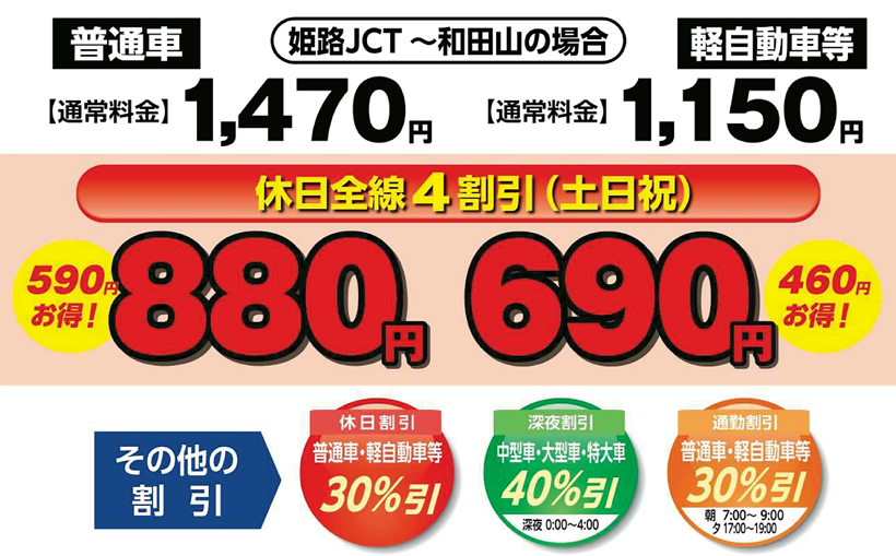 ※40%割引は姫路JCTから和田山まで利用した場合(途中区間の利用は30%割引)