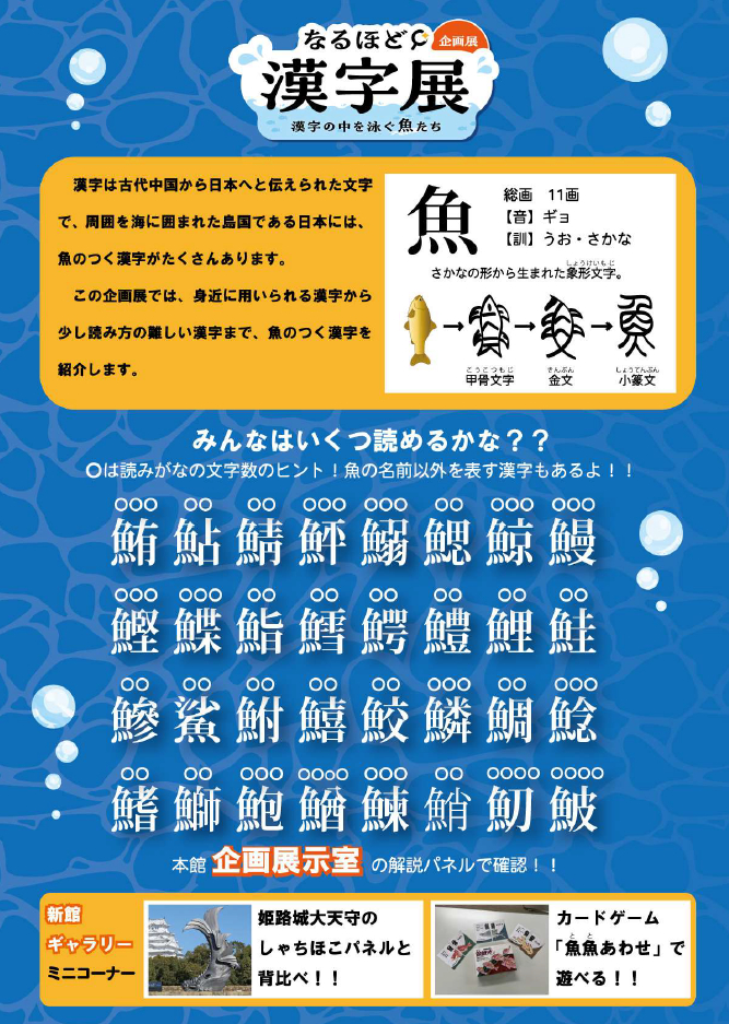 | 展示内容 | ◆本館 企画展示室 魚偏のつく漢字の成り立ちや、それらに関連する生体や標本・レプリカを展示・解説で紹介します。 ◆新館2階 水族館ギャラリー |
