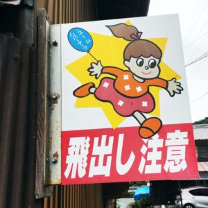 見た目ではちょっとわかりにくい事象に対して「落石注意(落石があるかも)」「感電注意(感電するかも)」「飛び出し注意(飛び出しがあるかも)」という危険予測を促すイメージですが、こちらの看板は目前にガケにも関わらず「ガケがある」。